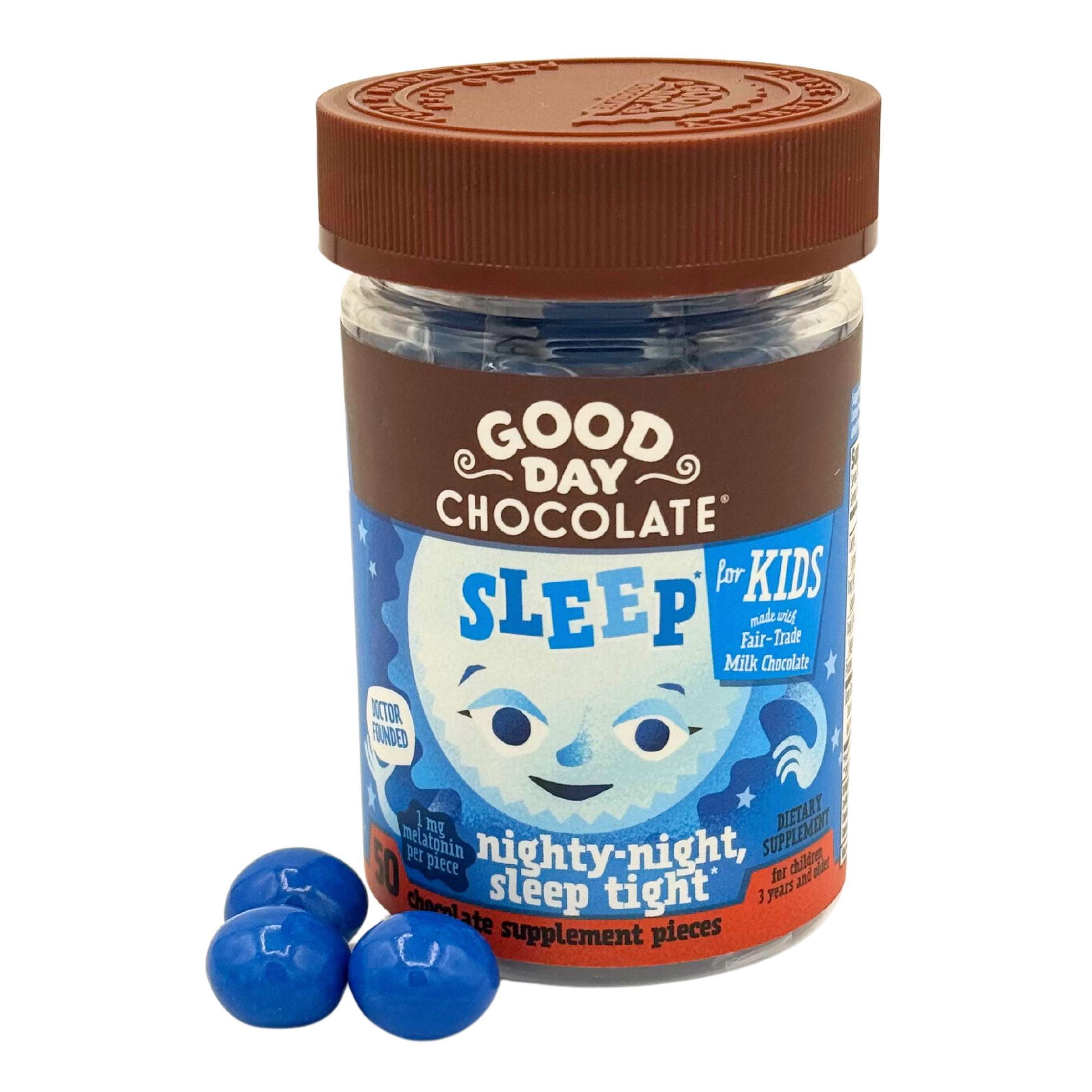Give your child the gift of restful sleep with Good Day Chocolate’s Kids Sleep supplement. Each delicious milk chocolate piece is infused with 1mg of melatonin, helping kids wind down and fall asleep naturally. Made with gentle, non-GMO ingredients, it’s a tasty and safe way to support a healthy bedtime routine, ensuring sweet dreams for your little ones